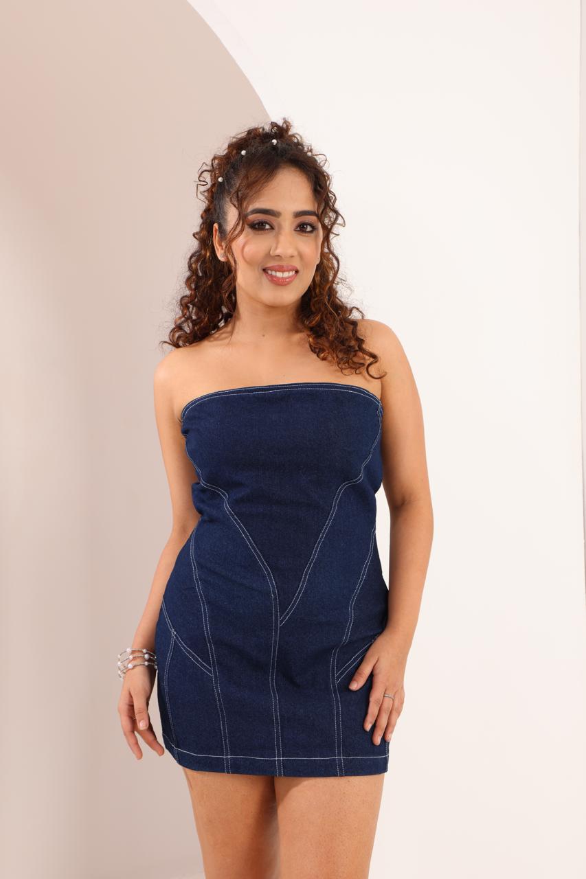 Make a statement with our strapless denim mini dress, designed for the modern, confident woman. Crafted from structured dark-wash denim with contrast stitching, this piece hugs your curves while offering a sleek, sculpted silhouette. Perfect for day-to-night transitions, pair it with chunky boots for an edgy vibe or elevate it with heels for a chic evening look. Effortless, versatile, this dress is a wardrobe essential.